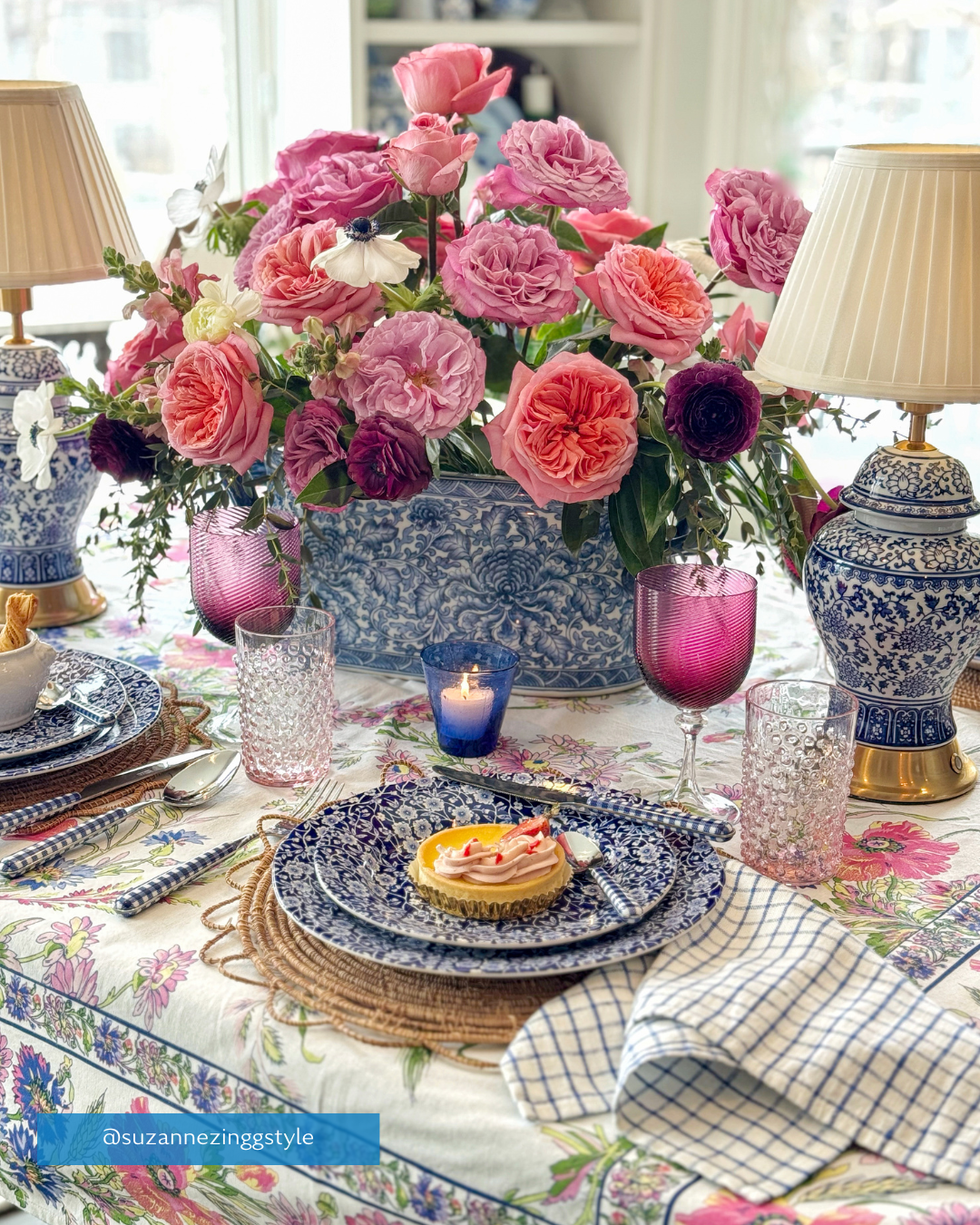 This spirited setting brings together blue-and-white florals reminiscent of antique calico quilts, gingham-handled flatware with a picnic-perfect vibe, and red glass goblets that call to mind celebratory toasts and festive July evenings. A red-rimmed charger adds a homespun, handcrafted touch, while our floral napkins and pressed petal plates lend softness and a sense of occasion.