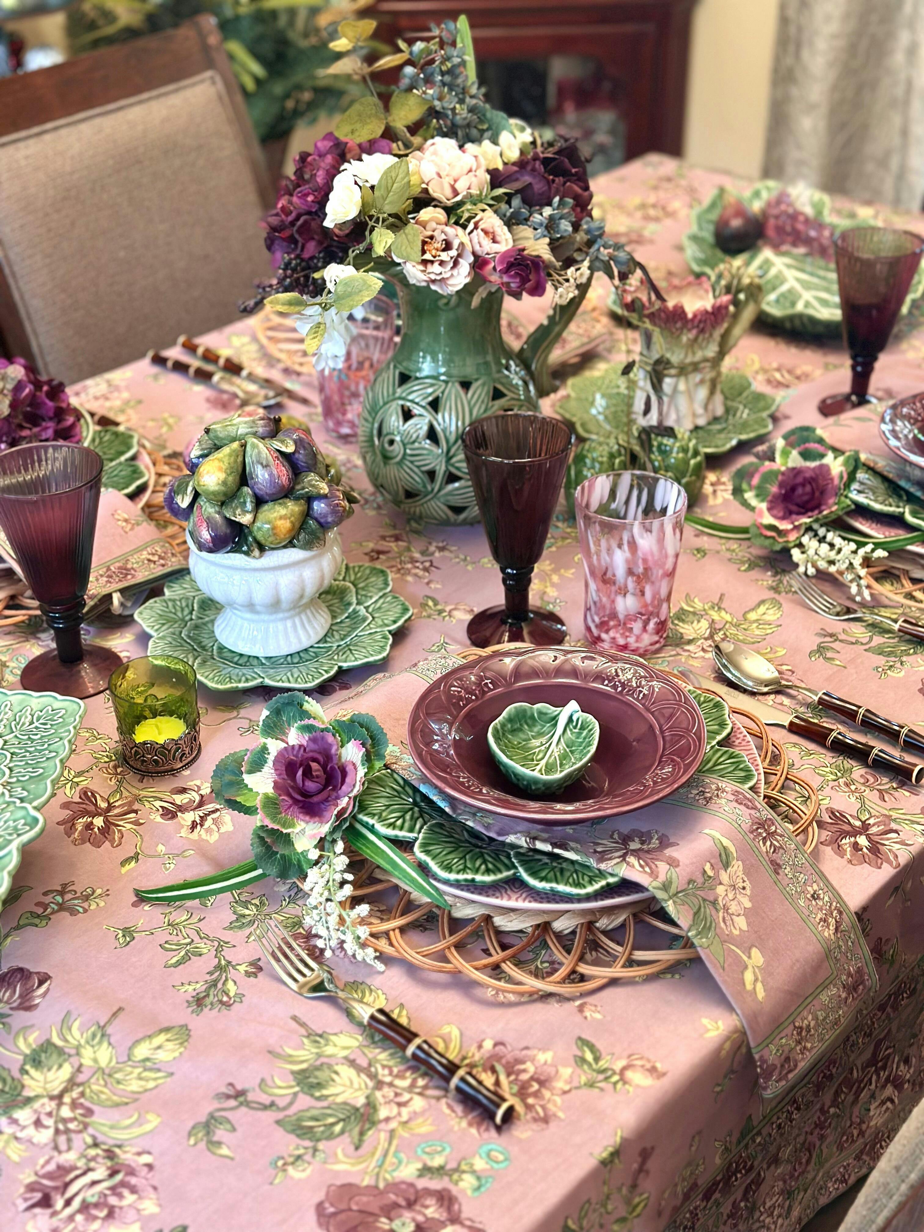 Ease into your autumn table setting with lavender and green infused with ecru and a touch of aqua florals. Inspired by the simplicity of country gardens and the laid-back elegance of sweet friendly gatherings, it’s perfect for everything from casual brunches to fancy dinners. A classic design that adds a crisp, inviting touch to any setting.