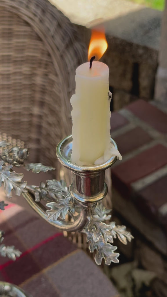 This elegant candelabrum features 3 sockets in a stylish pewter design, complete with intricate acorn and oak leaf details. The tall stem is finished with a sturdy base that makes it easy to position on any surface.